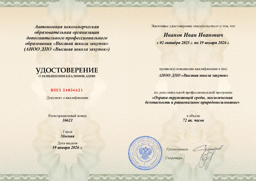 Повышение квалификации, 72 академических часа, 9 модулей: правовые основы и государственное управление в области экологии, производственный экологический контроль, документирование деятельности, система экологического менеджмента (ISO 14001) и ответственность за нарушения. Онлайн-обучение в в Волгограде с итоговой аттестацией.
