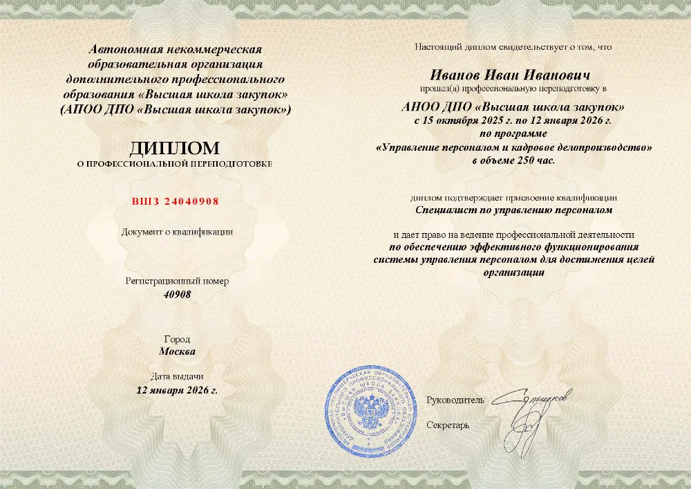 Профессиональная переподготовка, 250 академических часов, 19 модулей: трудовое законодательство и кадровое делопроизводство, подбор, мотивация и оценка персонала, психология менеджмента и разрешение конфликтов, автоматизация документооборота и работа с персональными данными. Онлайн-обучение в в Волгограде с итоговой аттестацией.